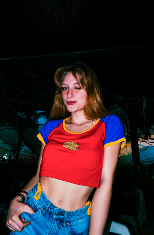 Göğsümde kedi uyuyo, kırmızı mavi slim fit desenli crop retro tasarım tişört