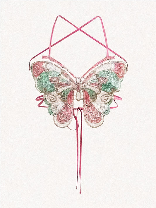 Nakış kelebek işlemeli çok yönlü crop üst kelebek top